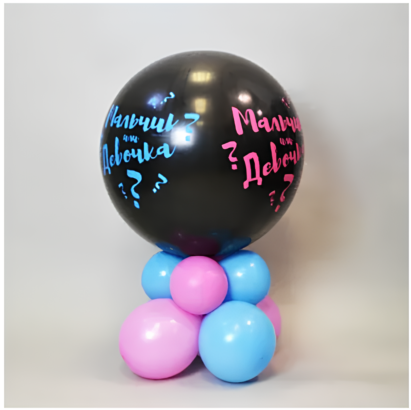 Огромный чёрный шар для гендер пати с принтом "Мальчик или Девочка?" в розовых и голубых тонах. Этот шар не только символизирует загадку, которую предстоит раскрыть, но и привлекает внимание своим стильным и элегантным дизайном. Он наполнен конфетти и ждёт момента, когда вы откроете его, чтобы раскрыть пол вашего будущего малыша и наполнить зал радостью и счастливыми эмоциями.