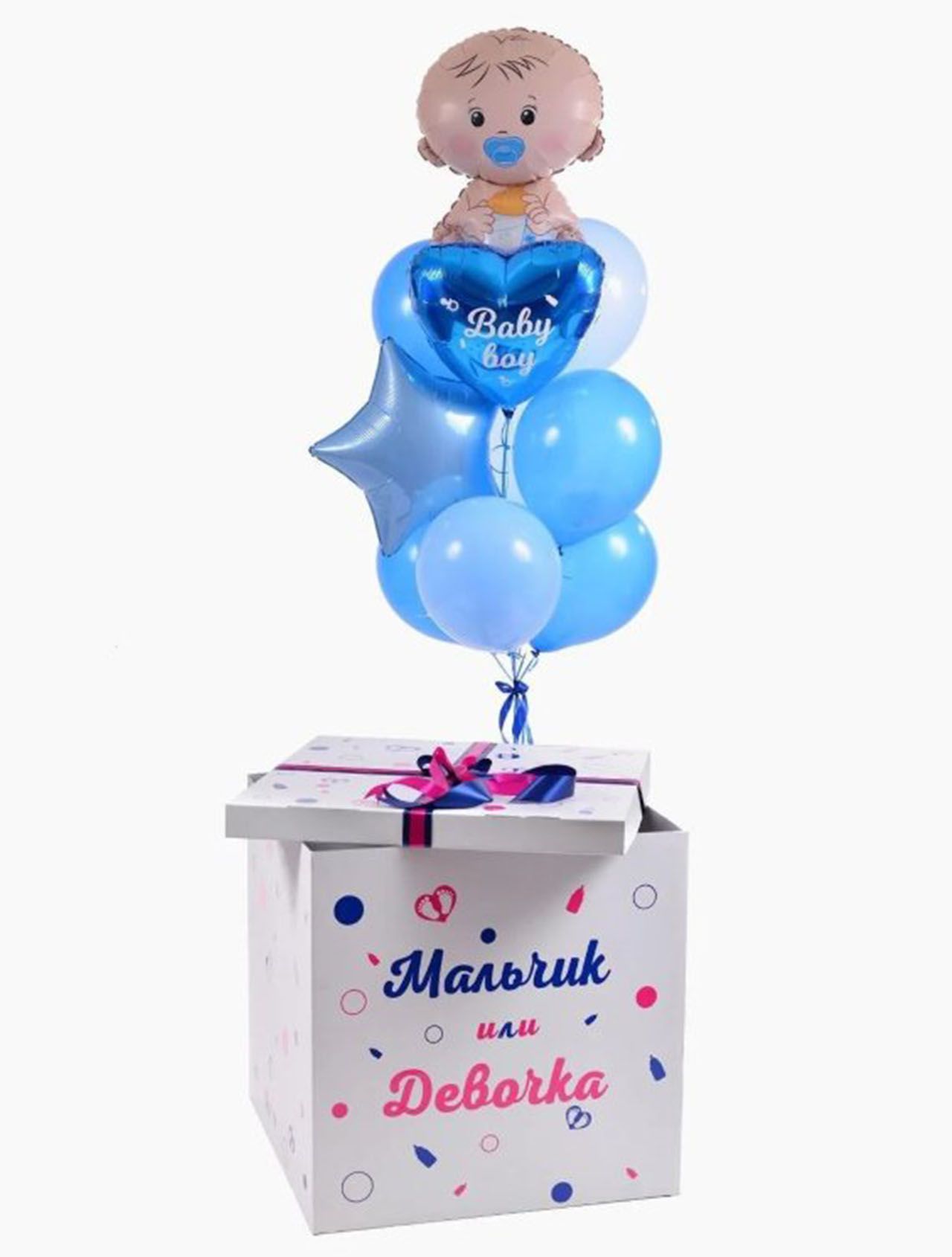 В комплект входит белая коробка с индивидуальным декором и надписью на ваш выбор, добавляя личный штрих к вашему празднику. Фонтан из воздушных шаров, надутых гелием, подарит вам яркую и радостную атмосферу, а шарики в форме пупсика, сердца и звезды добавят нежности и тепла в оформление. Вы также можете добавить любую надпись на шарик в форме сердца, чтобы подчеркнуть вашу любовь и радость этого особенного времени.