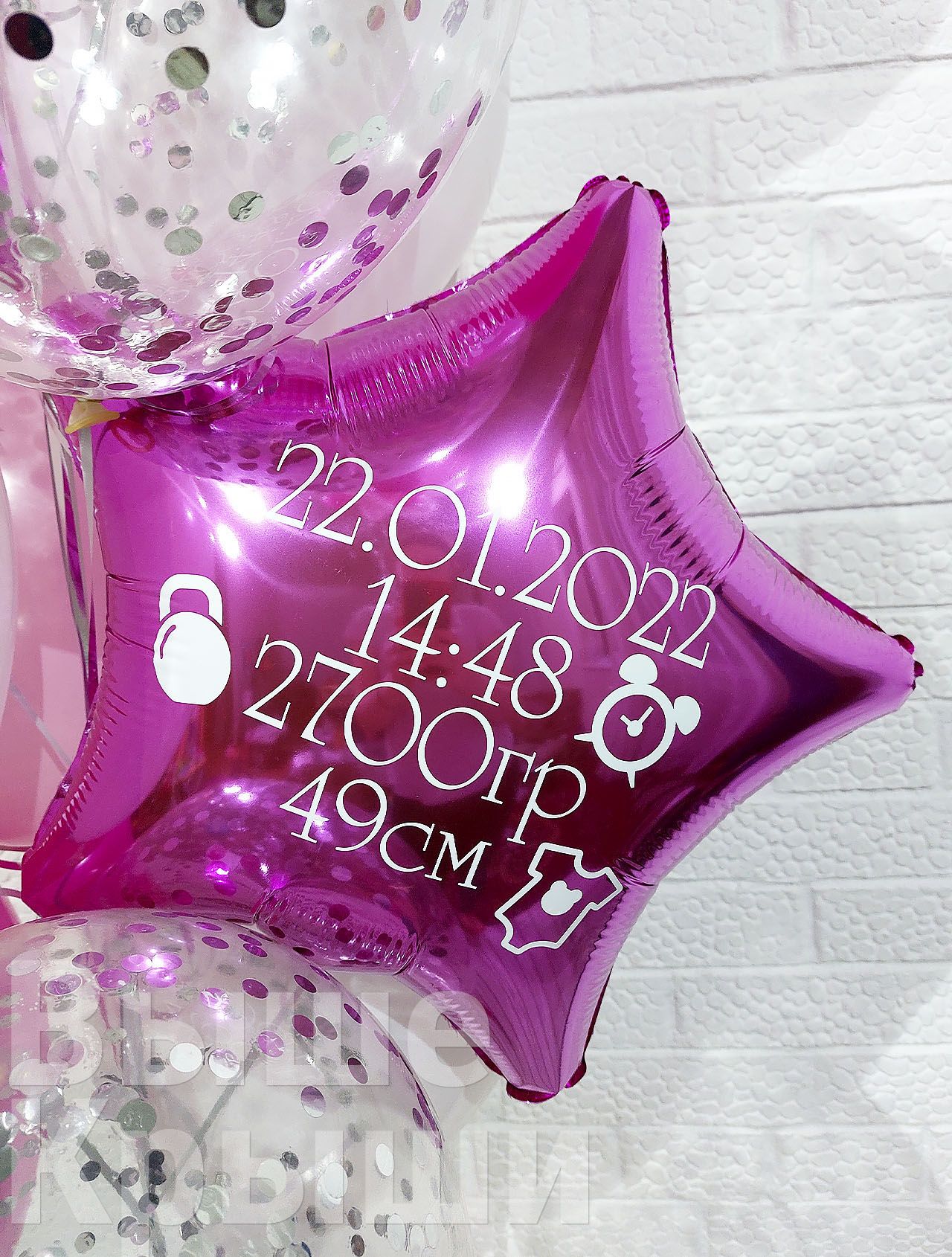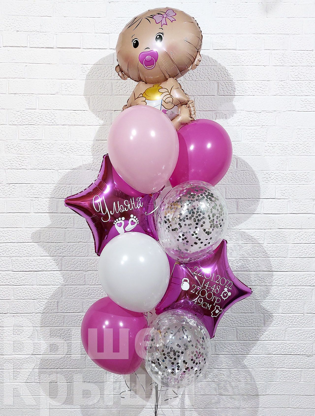 Сет "Пупсик девочка" — это нежная и трогательная композиция, созданная специально для выписки маленькой принцессы. Главным украшением этого сета является фольгированный шар в форме пупса, который выглядит невероятно мило и вызывает улыбки. Композицию дополняют прозрачные шары с конфетти и звезды с персональной надписью, которая чаще всего включает имя новорожденной, дату и время рождения, вес и рост. Эти детали делают момент ещё более особенным и запоминающимся.