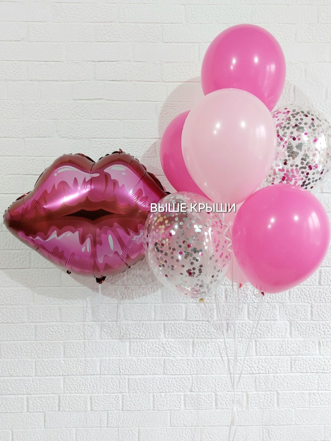 Нежные пастельные шары гармонично сочетаются с прозрачными шарами, наполненными конфетти, создавая лёгкий и праздничный эффект. Главным акцентом композиции выступает фольгированный шар в виде губ — смелый и запоминающийся элемент, который делает этот набор особенным и выразительным.