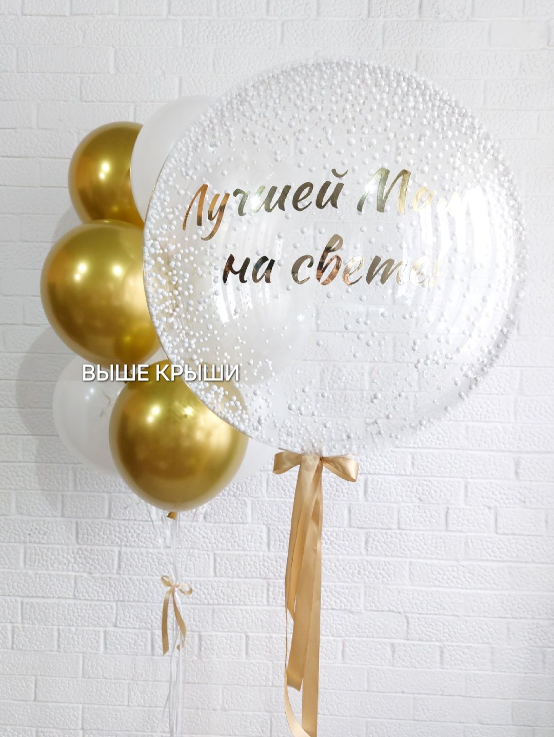 Нежные пастельные шары создают мягкую и тёплую атмосферу, а хромированные шары добавляют праздничного блеска и изысканности. Главным акцентом композиции является прозрачный баблс-шар с пеношариками и индивидуальной блестящей надписью, что делает подарок уникальным и личным.