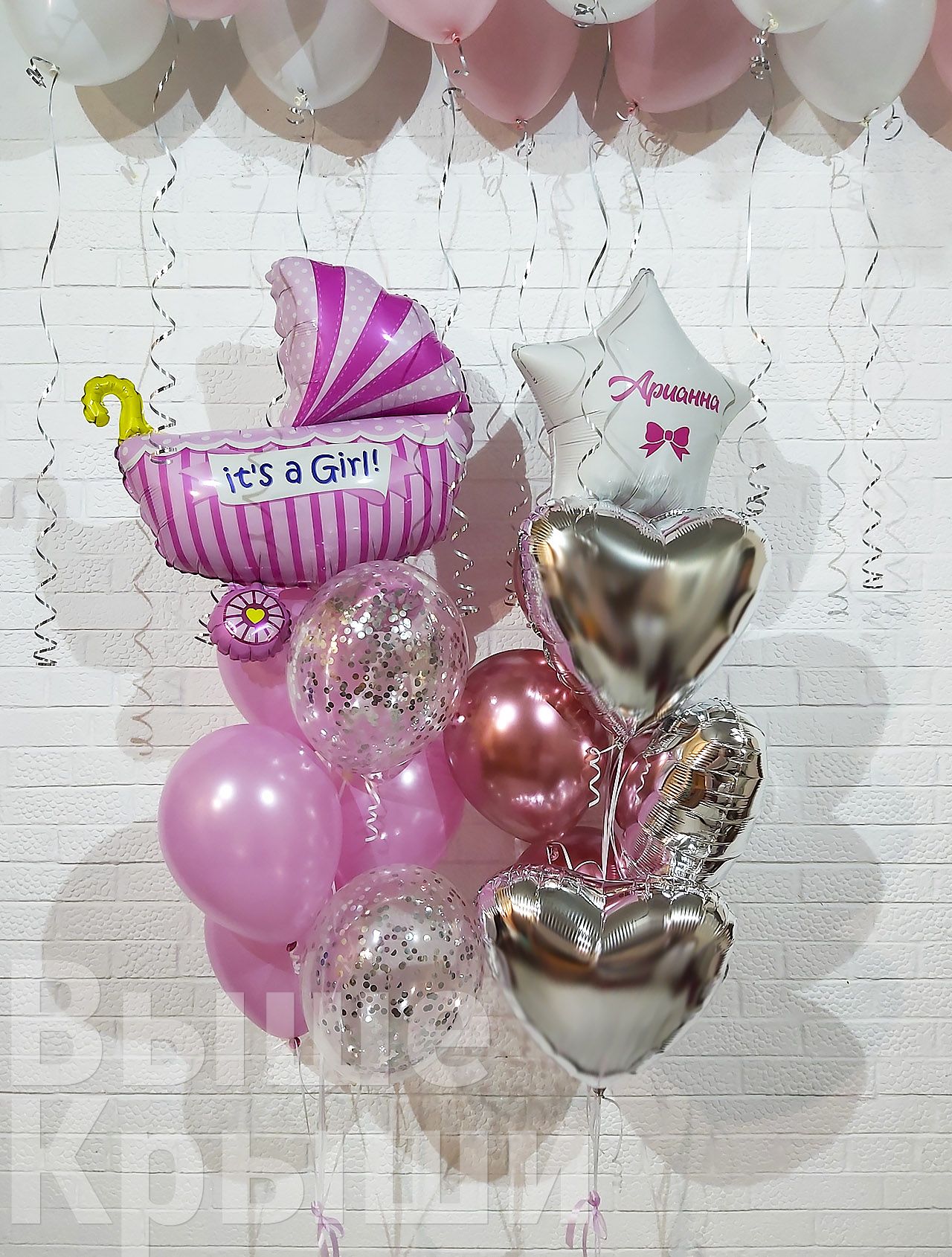 Основу композиции украшают фольгированные сердца и изящная звезда с персонализированной надписью, где можно отразить имя малышки, дату её рождения или другие важные моменты.
