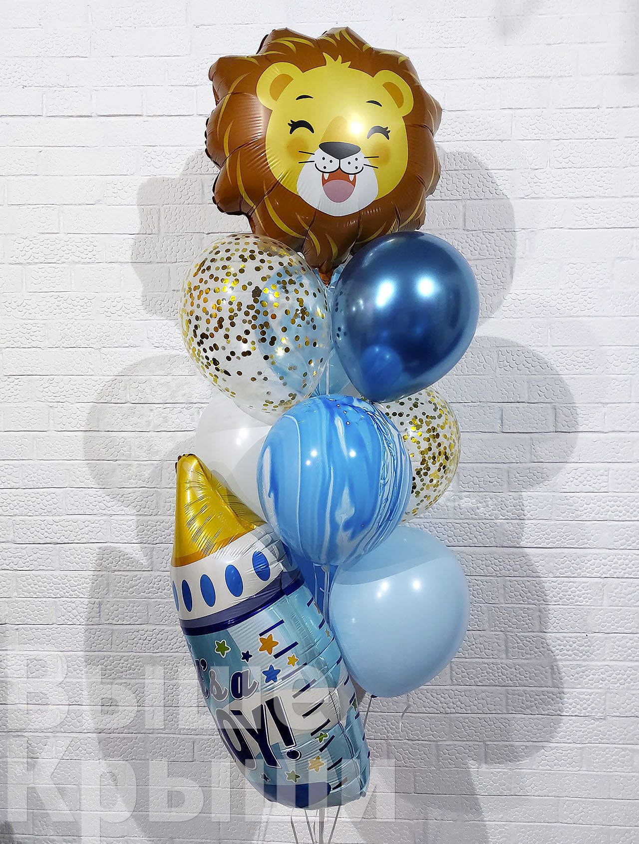 Сет "Малыш Лев" — это оригинальная и смелая композиция, которая станет центром внимания на выписке вашего малыша. Главным украшением сета является фольгированный лев, символизирующий силу и мужество новорожденного, а также фольгированная бутылочка, добавляющая милый детский акцент. Прозрачные шары с конфетти, хромовые и мраморные шары создают гармоничный баланс, придавая сету стиль и элегантность.