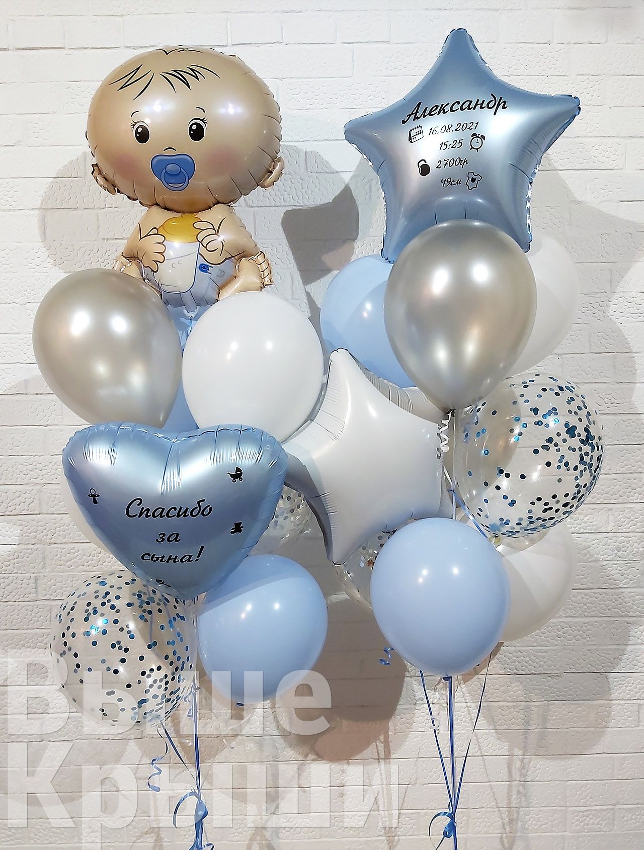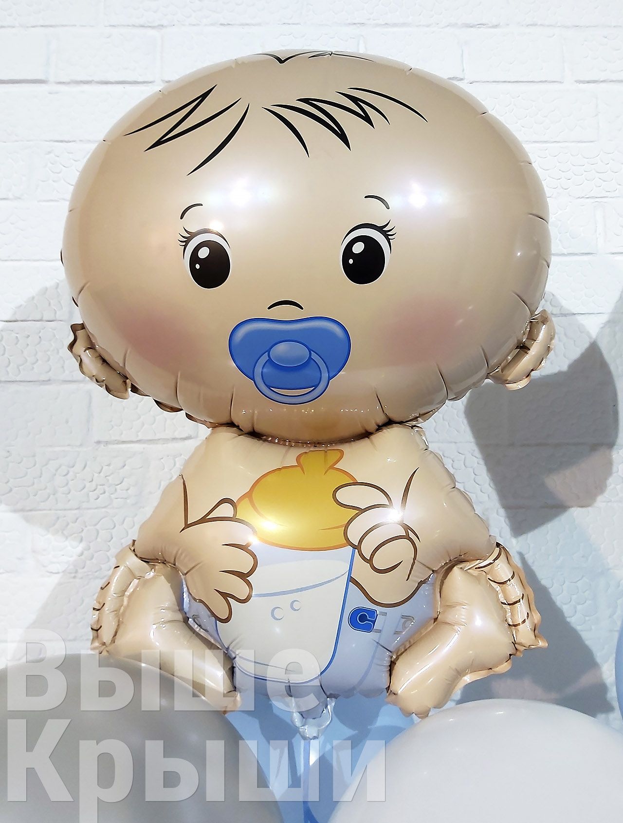 Фольгированный пупс в центре создаёт акцент, а фонтан из шаров будто бы заключает радость и нежность этого дня в символический букет.
