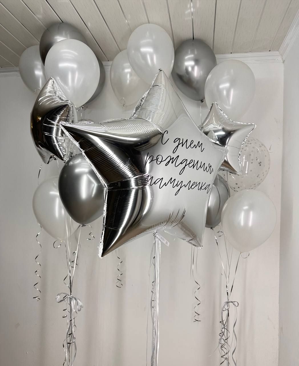 Металлизированные и хромированные шары придают композиции роскошь и утончённый блеск, а прозрачные шары с конфетти создают воздушный, снежный эффект. Главный акцент сета — большая фольгированная звезда с индивидуальной надписью, которая добавит композиции уникальность и сделает её особенной для виновника торжества.