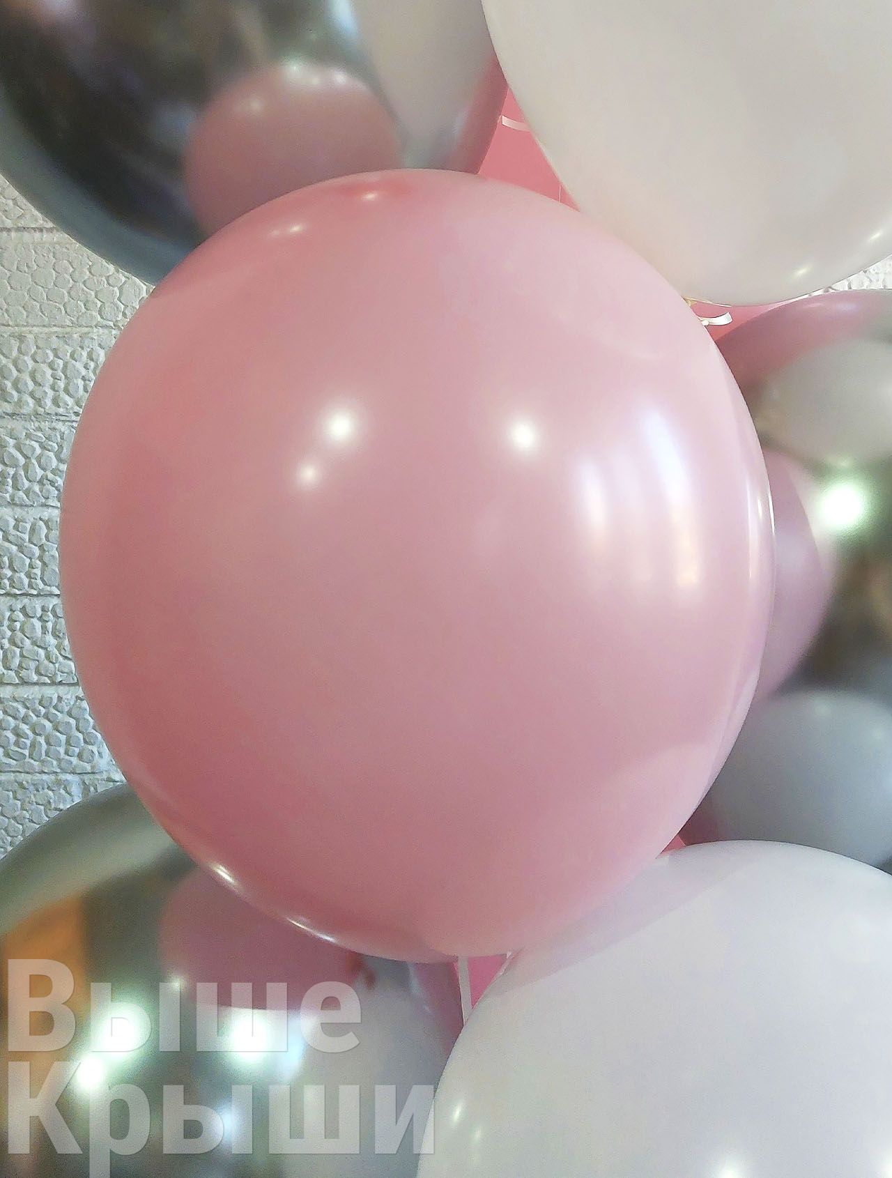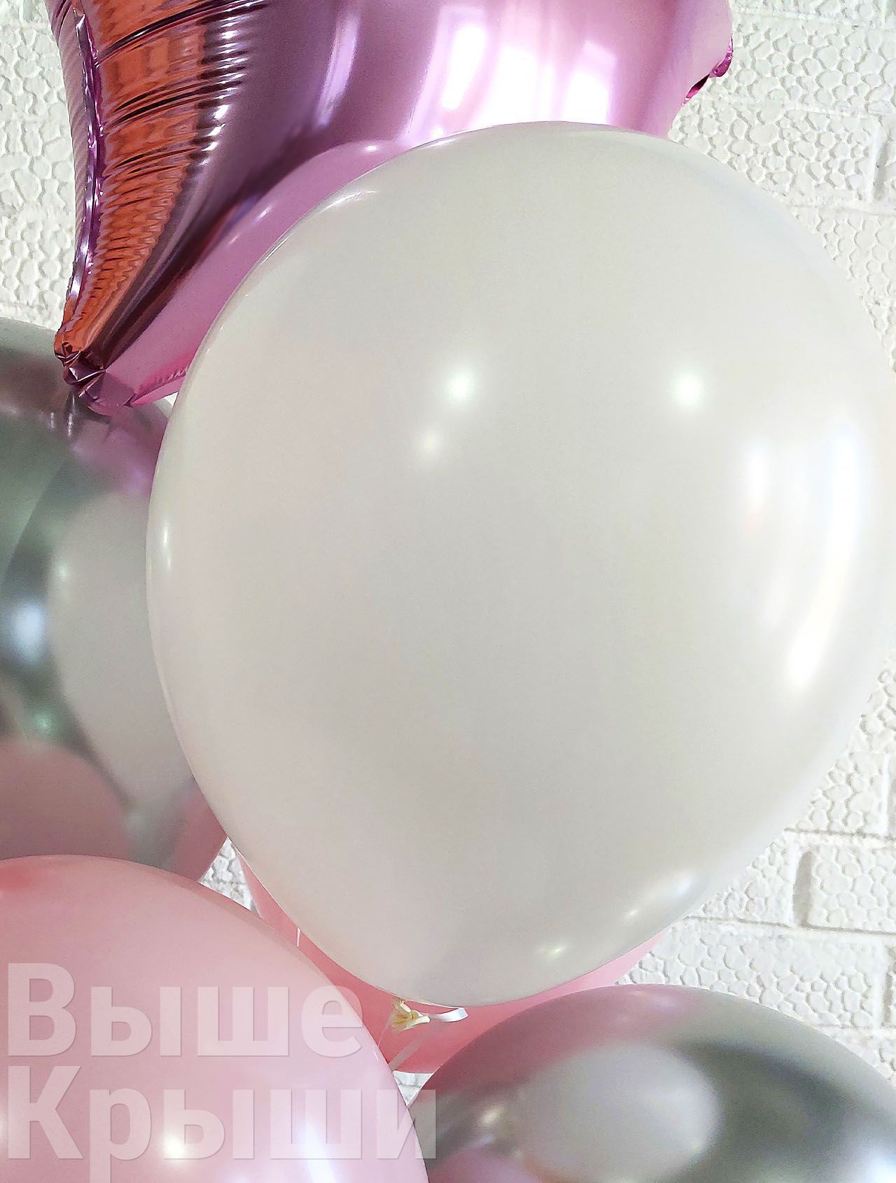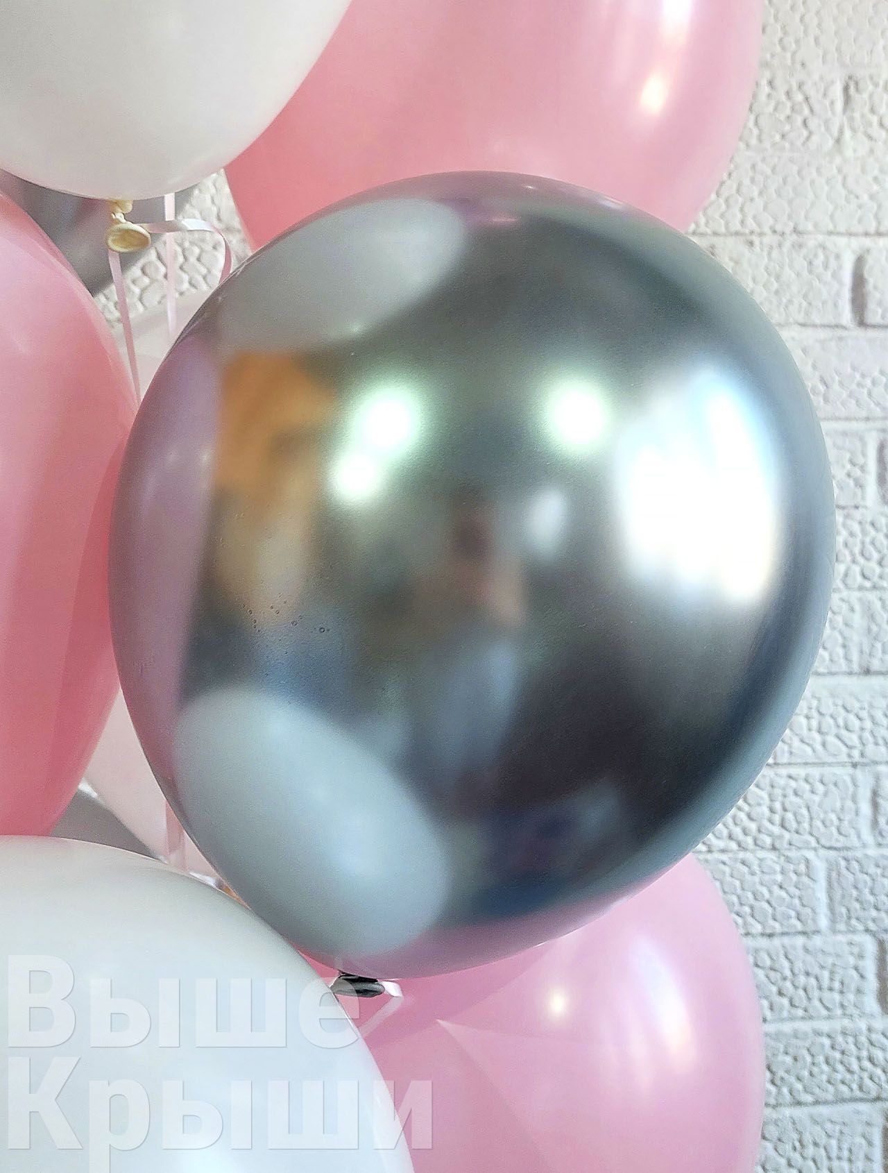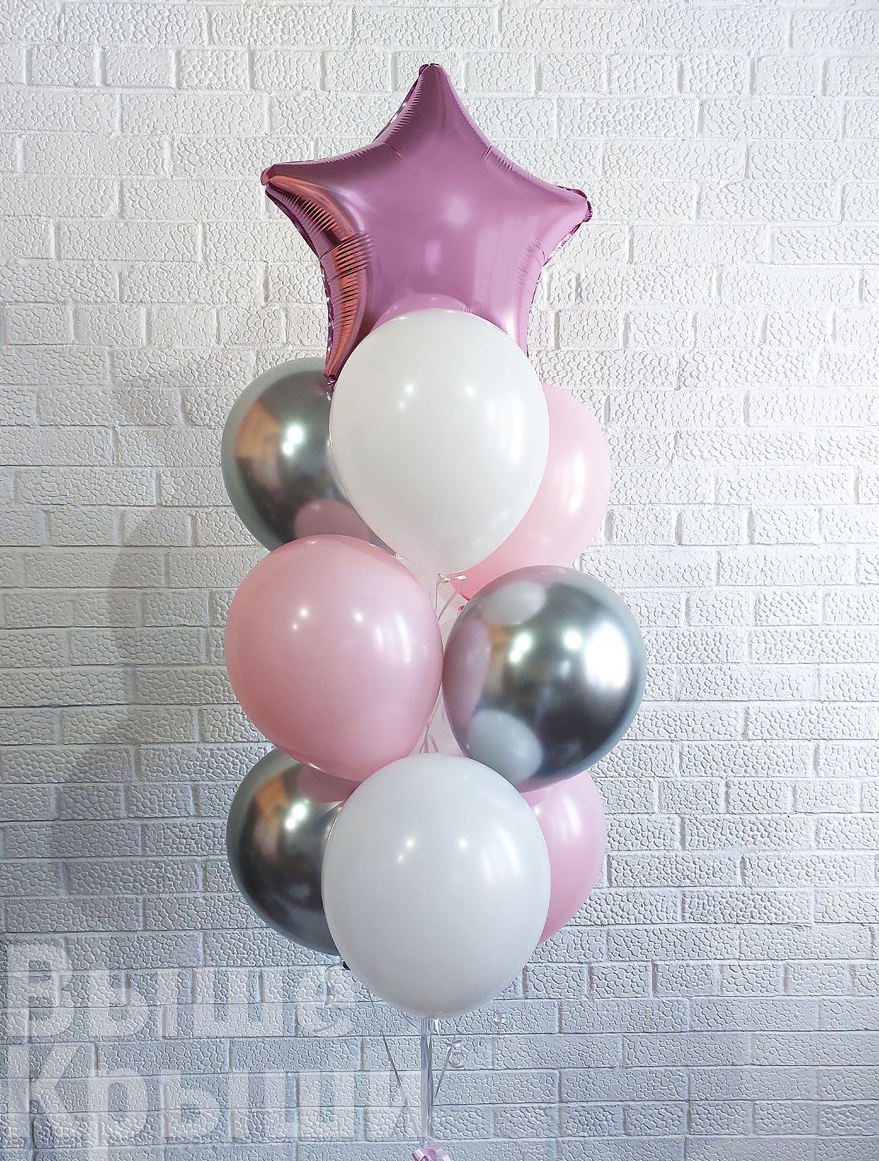 Пастельные шарики создают лёгкую и приятную атмосферу, а хромированные шары добавляют нотки изящества и современности. Фольгированная звезда становится ярким акцентом, который завершает композицию, придавая ей праздничный характер.
